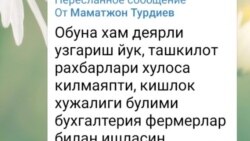 Между тем, один из предпринимателей из Ургутского района Самаркандской области отправил в нашу редакцию скриншот переписки главы района в Telegram'е, где чиновник пишет о плане районной администрации по организации подписки на периодические печатные издания.