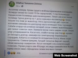 Пользовательница @Dilafruz Yunusova Zoirova, которая в настоящее время вместе со своей семьей проходит лечение от коронавируса в городской клинической больнице №1 имени Ибн Сино в Ташкенте, написала в Facebook'е, что взятие расписок отбило у врачей этой больницы желание работать.