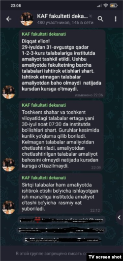 «В рамках подготовки ко Дню Независимости, в столицу приглашены областные студенты Ташкентского института искусств и культуры. Особенно в этих мероприятиях участвуют девушки. В жару не соблюдаются правила карантина. «Если вы не придете, подумайте о том, как будете учиться дальше», - угрожают нам. Мы просим министра высшего образования обратить внимание на этот вопрос», – написала в редакцию «Озодлика» студентка Узбекского государственного института искусств и культуры, пожелавшая остаться анонимной.