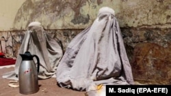 Женщины в бурках, которые покинули свои дома на севере Афганистана из-за наступления талибов, собрались в парке Кабула, чтобы получить помощь. Фото сделано 13 августа 2021 года, за два дня до того, как талибы вошли в Кабул.
