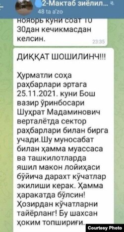 «Уважаемые руководители отрасли. Завтра, 25.11.21, заместитель премьер-министра Шухрат Мадаминович вместе с руководителями секторов проведет облет местности. В связи с этим, в рамках проекта зеленые насаждения всем учреждениям и организациям необходимо приступить к посадке саженцев деревьев. Все должны быть активными! Готовьте саженцы прямо сейчас! Это личное поручение хокима области», – говорится в сообщении областной администрации.