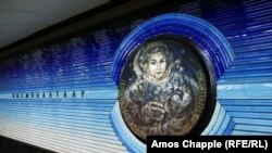 Валентина Терешкова – первая женщина в космосе – увековечена на станции Космонавтов. Цвет керамических панелей на стенах переходит из голубого в черный, имитируя атмосферу Земли.